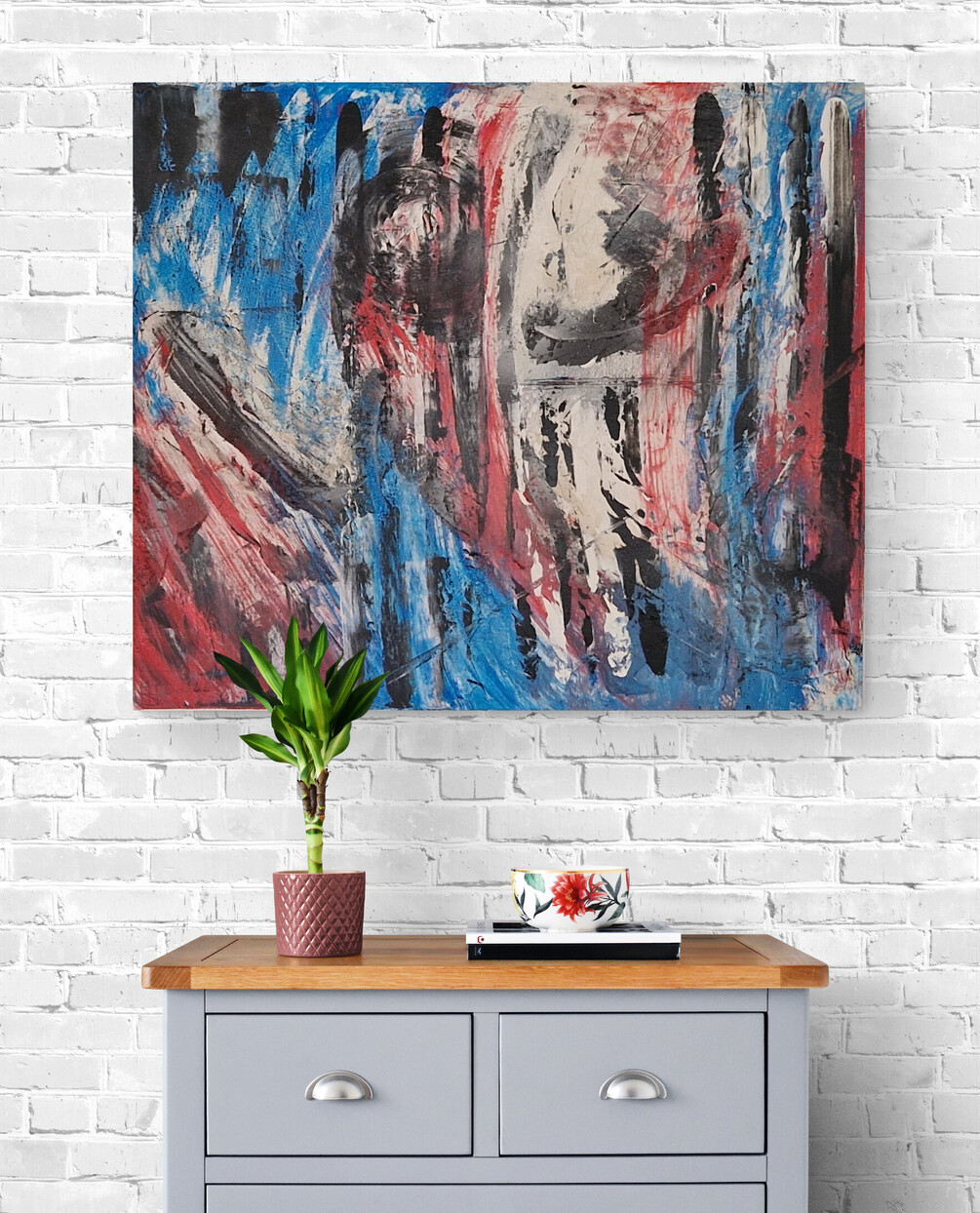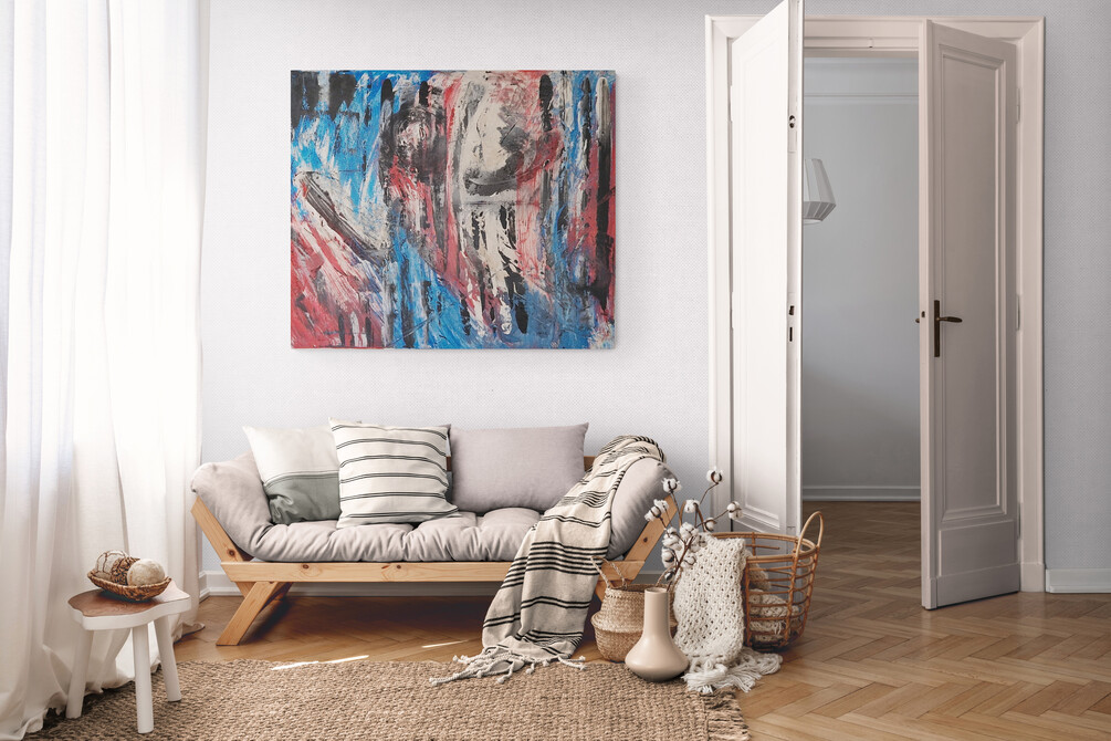 In "The Dance of Color Nuances" a fascinating painting unfolds that captures the dynamic movement of blue, white, red and black. The deep blue centerpiece radiates space and calm, while delicate veils of white create a mysterious aura. Red pulsates powerfully and embodies passionate energy, while black as a framing element adds depth and contrast. This lively composition tells a story full of emotions that captivates the viewer and immerses them in a colorful dance of nuances.